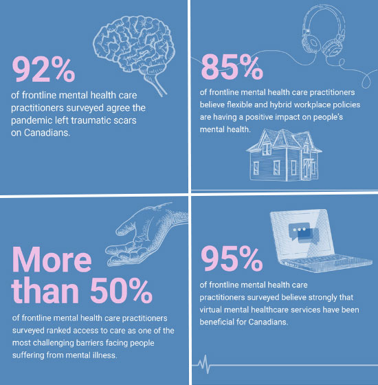 - 95% believe strongly that the virtual mental healthcare services that accelerated expansion during the pandemic have been beneficial for Canadians.